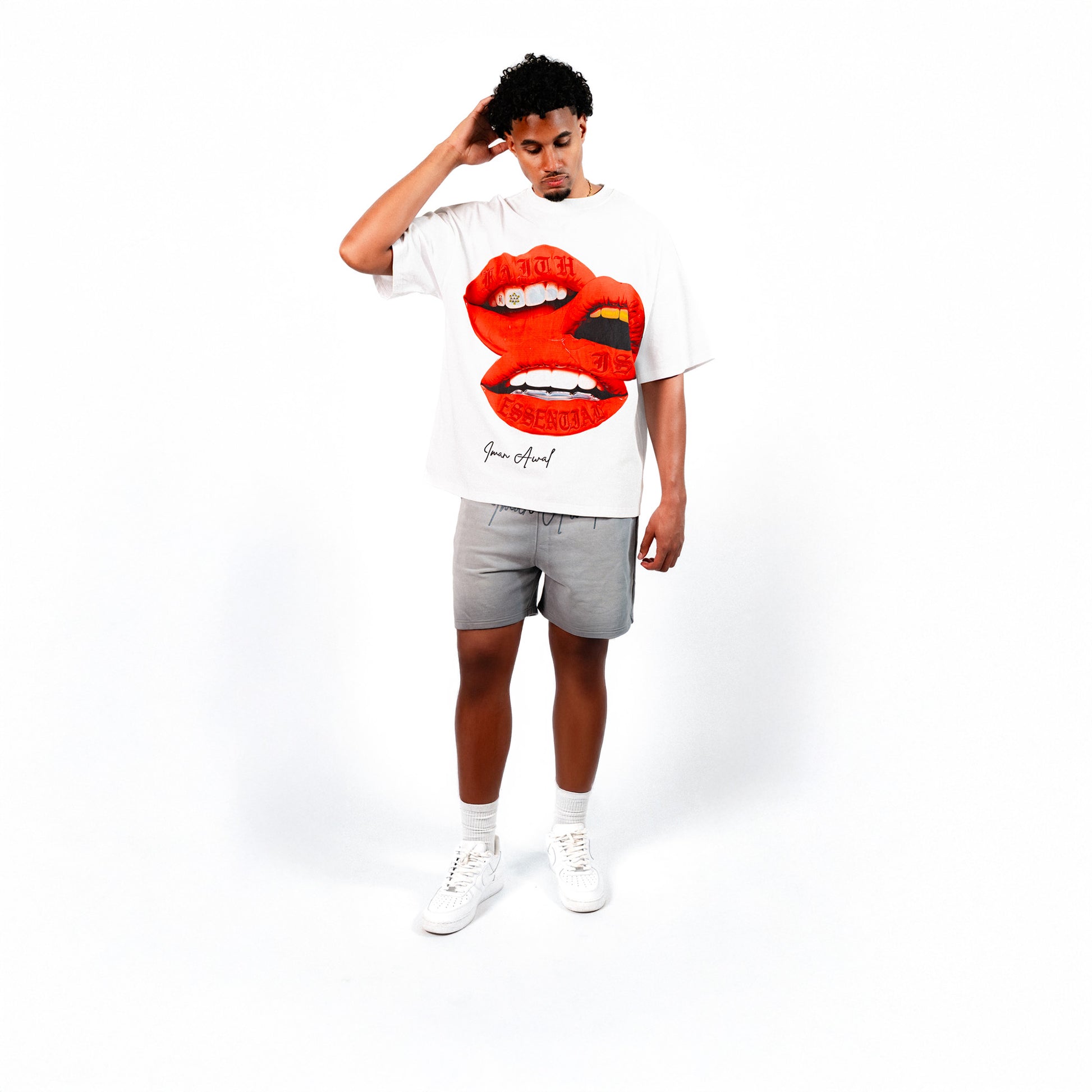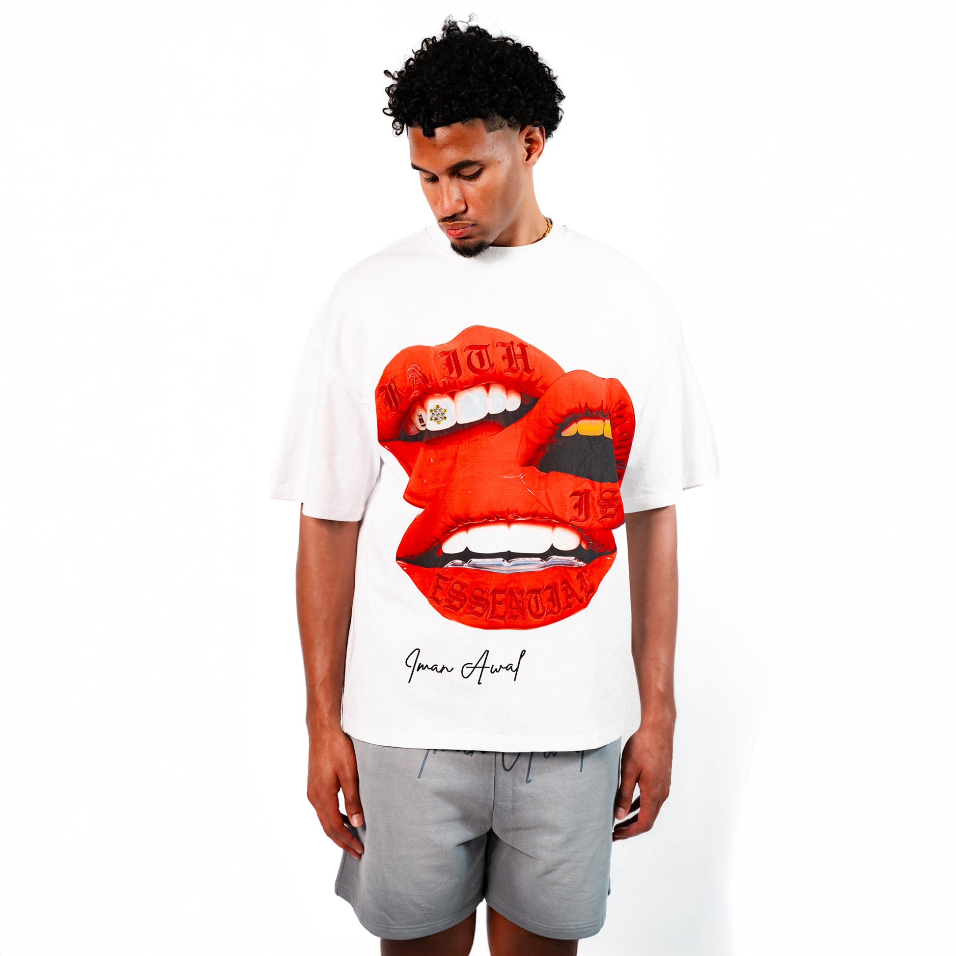 - Multicolored DTG lips graphic with embroidered “Faith Is Essential” lettering