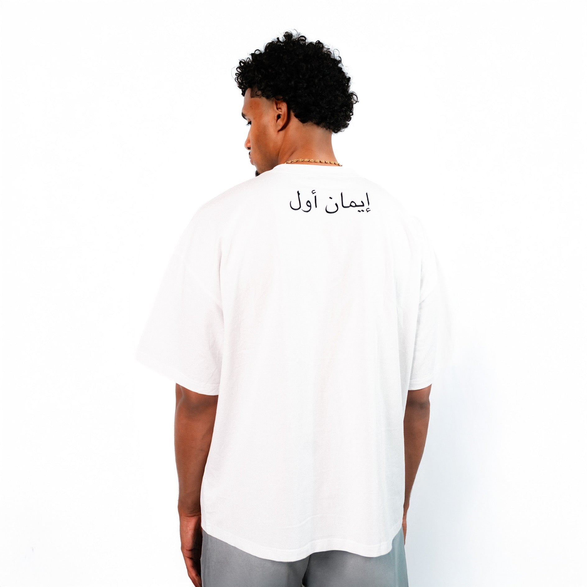 - Arabic calligraphy (“إيمان أول”) embroidery on the back