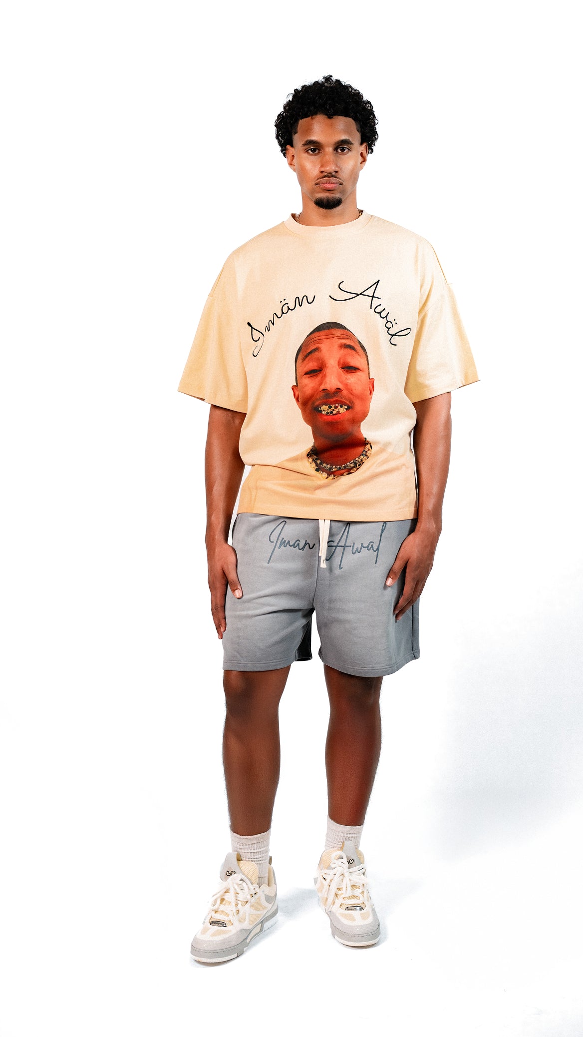 The front is boldly signed with an oversized embroidered “Iman Awal” script, while the back pocket carries the brand’s Arabic calligraphy mark, uniting global storytelling with modern streetwear minimalism. A 2-inch elastic waistband with flat drawcords ensures a secure yet comfortable fit, while clean hems and tailored proportions bring a sense of architectural balance to the relaxed silhouette.