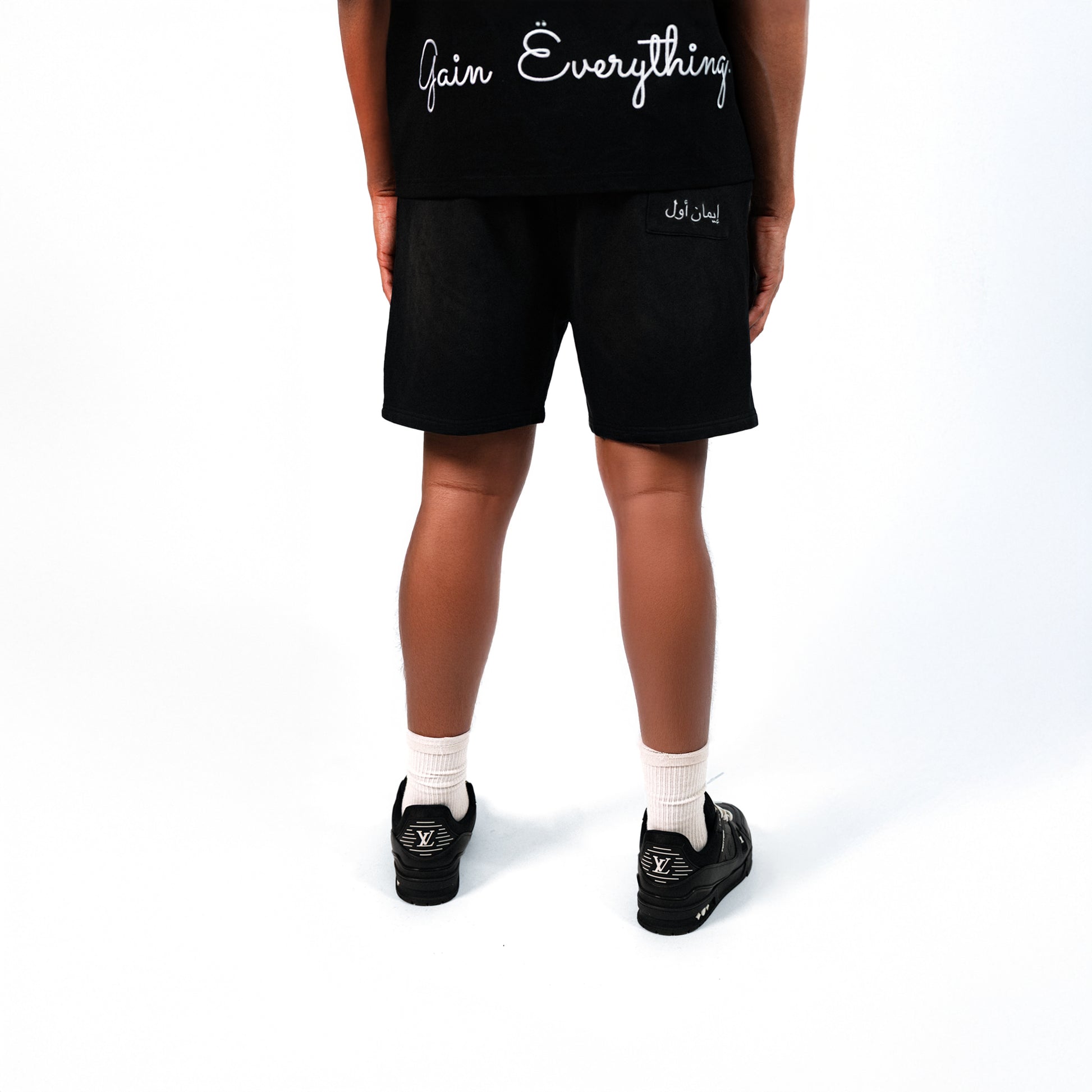 The front is boldly signed with an oversized embroidered “Iman Awal” script, while the back pocket carries the brand’s Arabic calligraphy mark, uniting global storytelling with modern streetwear minimalism. A 2-inch elastic waistband with flat drawcords ensures a secure yet comfortable fit, while clean hems and tailored proportions bring a sense of architectural balance to the relaxed silhouette.